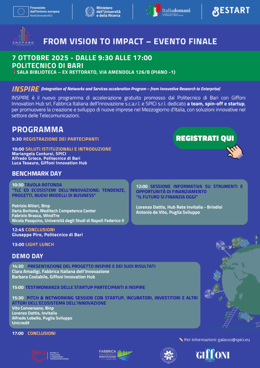 From Vision to Impact è l'evento conclusivo del Programma di Accelerazione INSPIRE – Integration of Networks and Services acceleration Program – from Innovative Research to Enterprise, realizzato nell’ambito del Partenariato Esteso RESTART – RESearch and innovation on future Telecommunications systems and networks, SPOKE 2, finanziato dal PNRR – Piano Nazionale di Ripresa e Resilienza e dall’Unione Europea – NextGenerationEU, sotto il coordinamento del Politecnico di Bari e in collaborazione con Giffoni Innovation Hub, SPICI Srl e Fabbrica Italiana dell’Innovazione.Il programma, avviato per valorizzare la ricerca applicata e promuovere l’imprenditorialità innovativa nei settori telecomunicazioni e servizi digitali sostenibili, ha accompagnato 5 startup, team imprenditoriali e spin-off nello sviluppo di soluzioni ad alto contenuto tecnologico.